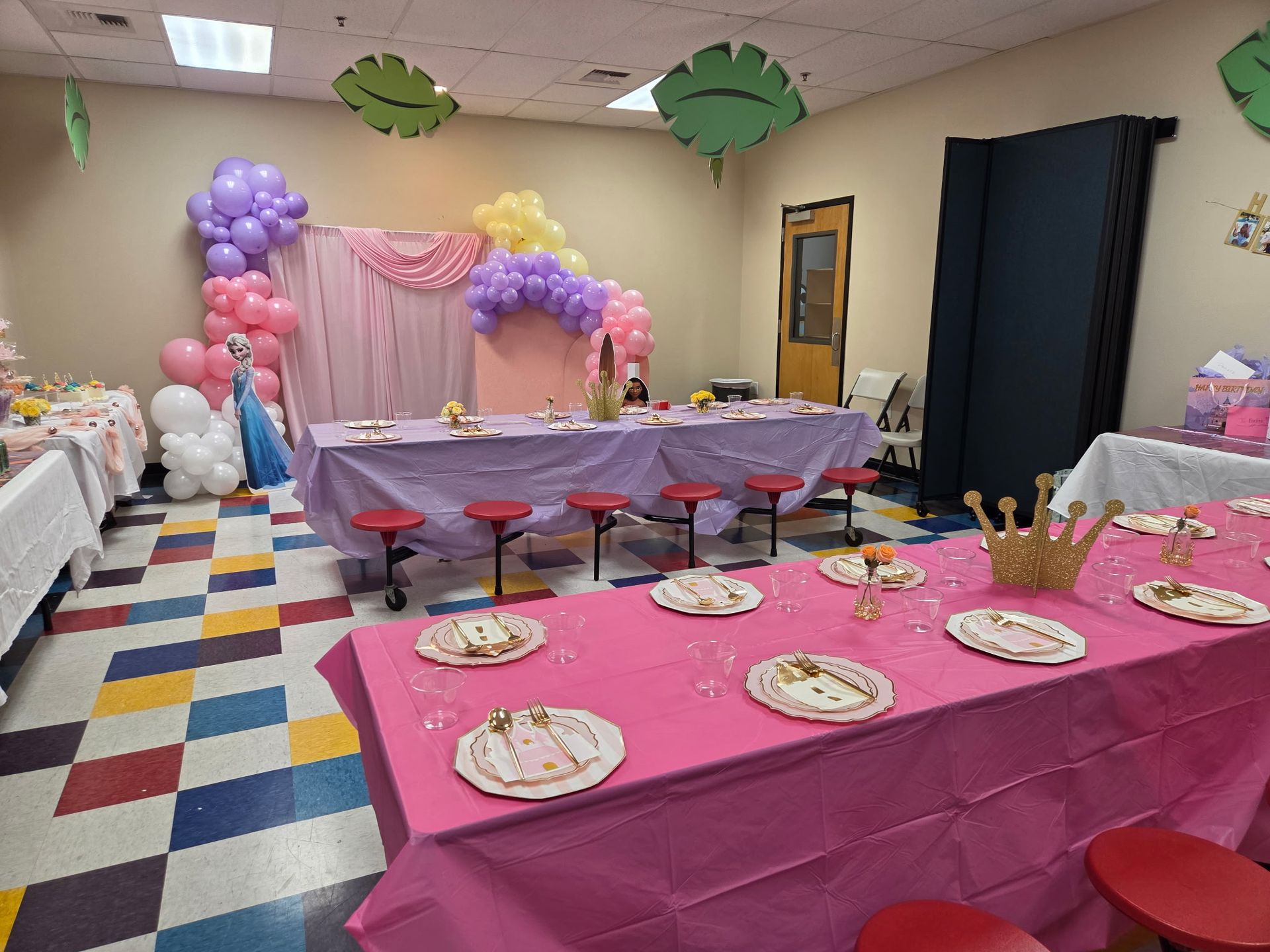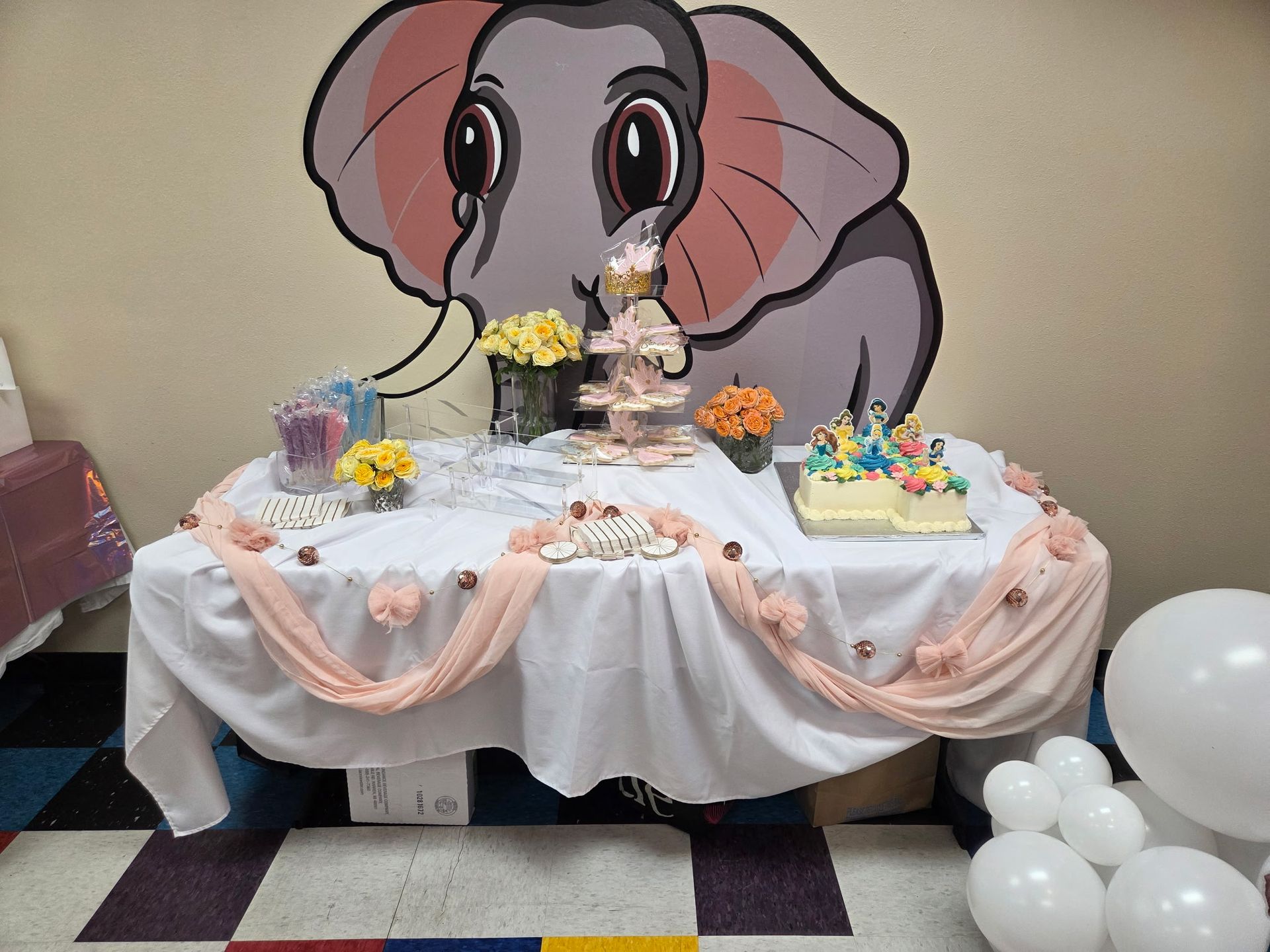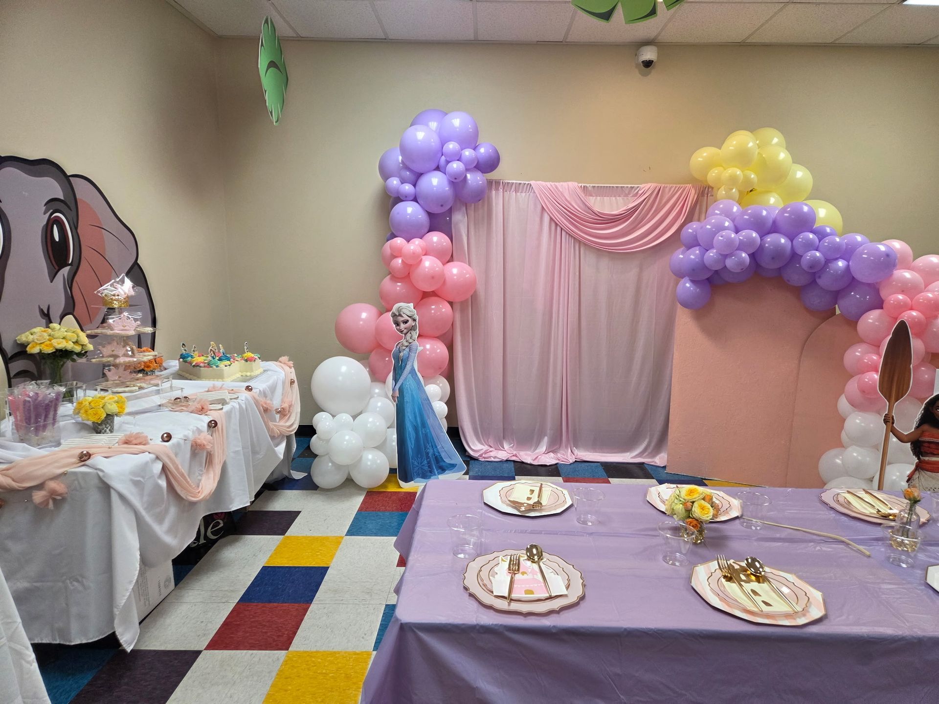 We can help you decorate for the party using your own decorations or we can provide solid colors from our inventory to match your party theme. We also have an extensive collection of themed decorations from previous parties, so just ask us to see what's available!
